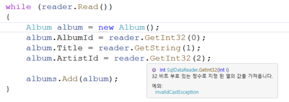 -> 몇번째 컬럼에 있는 값을 얻어오는지? reader.GetInt32(@@)