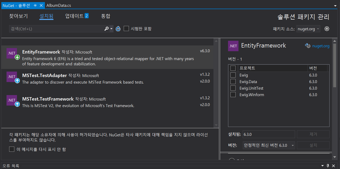 2-1. 지금은 제대로 설치가 되어있지만 나는 Ewig.Data가 6.2.0 버전으로 버전이 맞지않았음