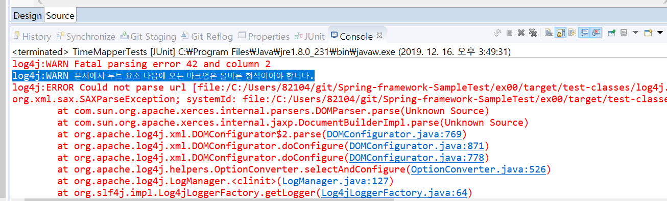 책과 다르게 </log4j:configuration> 태그 닫기전으로 코드를 옮기니 정상적으로 뜨긴 뜸...