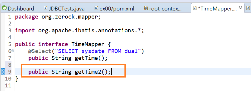 3-3-3. Mapper 인터페이스와 XML을 같이 이용해 보기 위해서 기존의 TimeMapper 인터페이스에 추가적인 메서드를 선언한다.