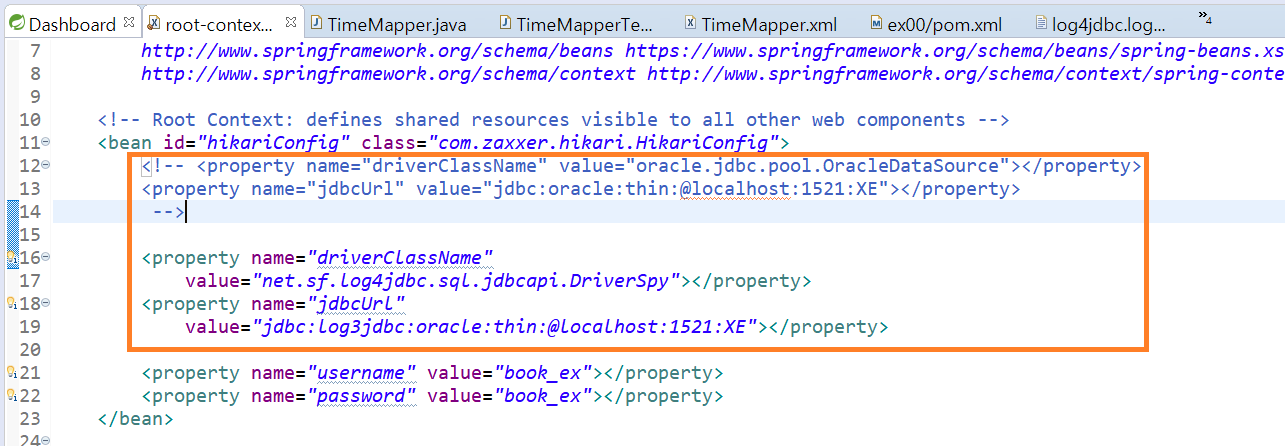 - JDBC 드라이버의 클래스를 'net.sf.log4jdbc.sql.jdbcapi.DriverSpy'로 수정하는 작업과 JDBC 연결 URL 부분에서 중간에 'log4jdbc' 문자열이 추가된다. 이 두 설정이 제대로 되어 있지 않으면 데이터베이스의 로그가 정상적으로 기록되지 않는다.