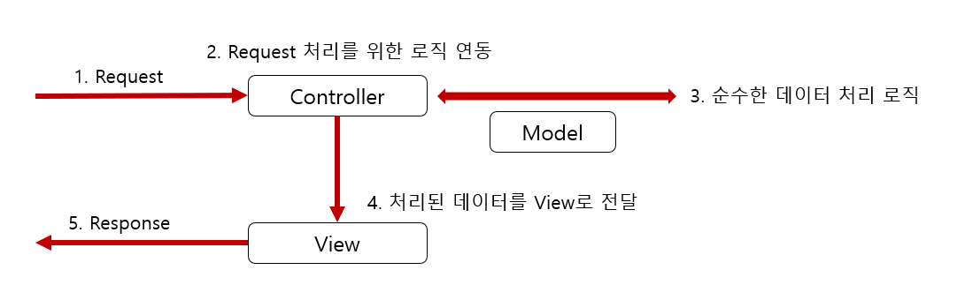 모델 2 방식에서 사용자의 Request는 특별한 상황이 아닌 이상 먼저 Controller를 호출하게 된다. 이렇게 설계하는게 가장 중요한 이유는 나중에 View를 교체하더라도 사용자가 호출하는 URL 자체에 변화가 없게 만들어 주기 때문이다. 컨트롤러는 데이터를 처리하는 존재를 이용해서 데이터(Model)를 처리하고 Response 할 때 필요한 데이터(Model)를 View 쪽으로 전달하게 된다. Servlet을 이용하는 경우 개발자들은 Servlet API의 RequestDispatcher 등을 이용해서 이를 직접 처리해 왔지만 스프링 MVC는 내부에서 이러한 처리를 하고, 개발자들은 스프링 MVC의 API를 이용해서 코드를 작성하게 된다.