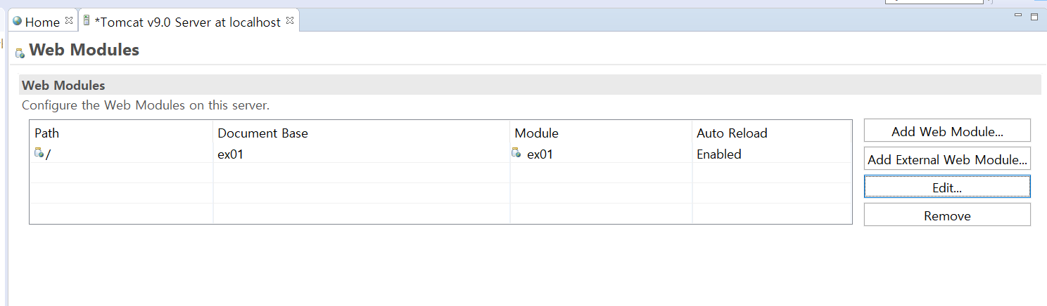 - 웹 프로젝트는 가능하면 절대 경로를 이용하는 구조를 사용하는 것이 바람직하므로, Tomcat의 'Modules' 메뉴를 이용해서 '/' 경로로 프로젝트가 실행될 수 있도록 처리한다. (혹은 해당 프로젝트 properties의 'Web Project Settings' 속성을 '/'로 지정한다.)