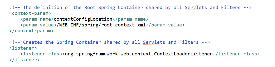 - <context-param> 에는 root-context.xml 경로가 설정되어 있고, <listner>에는 스프링 MVC의 ContextLoaderListener가 등록되어 있다. ContextLoaderListener는 해당 웹 애플리케이션 구동 시 같이 동작하므로 해당 프로젝트를 실행하면 가장 먼저 로그를 출력하면서 기록하는 것을 볼 수 있다.