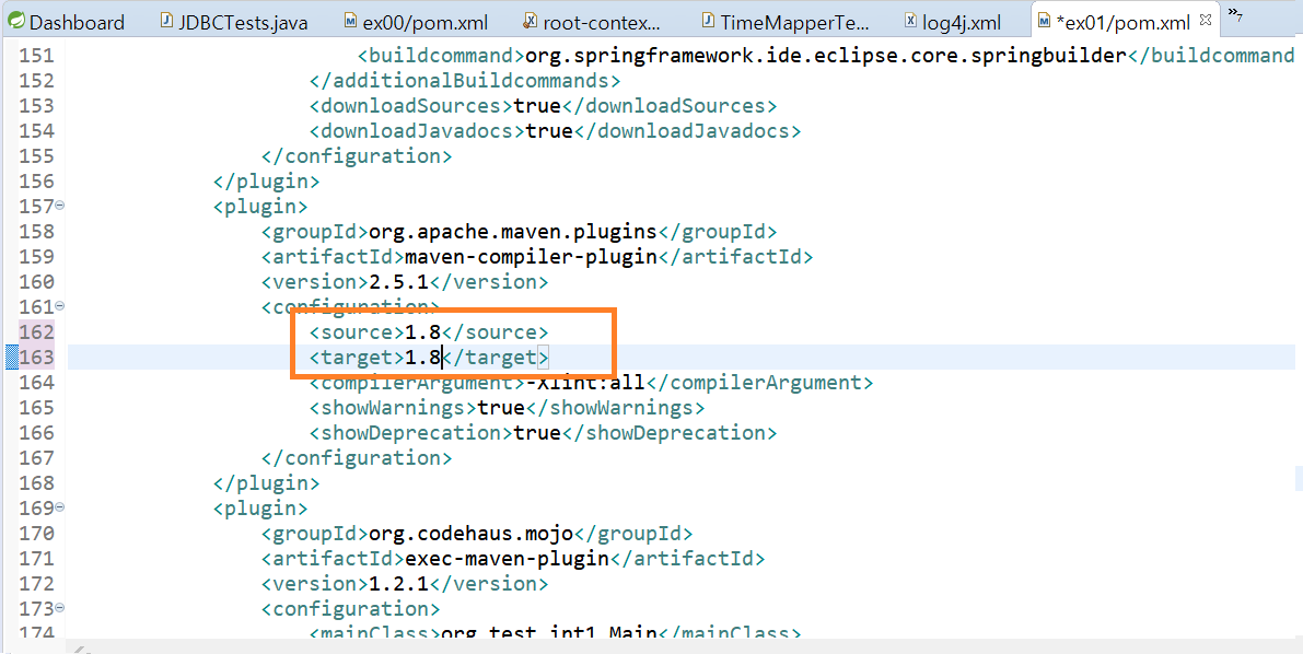 - Maven의 컴파일 옵션을 1.6에서 1.8로 변경하고 프로젝트의 'Maven' 메뉴에서 'update project'를 실행한다.