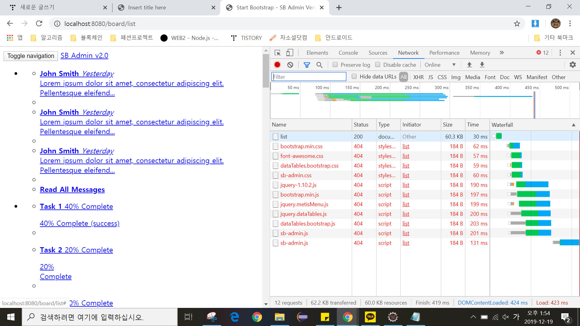 CSS와 JS 파일들의 경로를 수정하는 작업은 브라우저의 개발자 도구를 통해서 확인하며 진행한다. 개발자 도구를 통해서 현재 브라우저의 Network 부분을 확인하고, 페이지를 '새로고침'하면 잘못된 URL의 정보를 아래와 같이 확인할 수 있다.