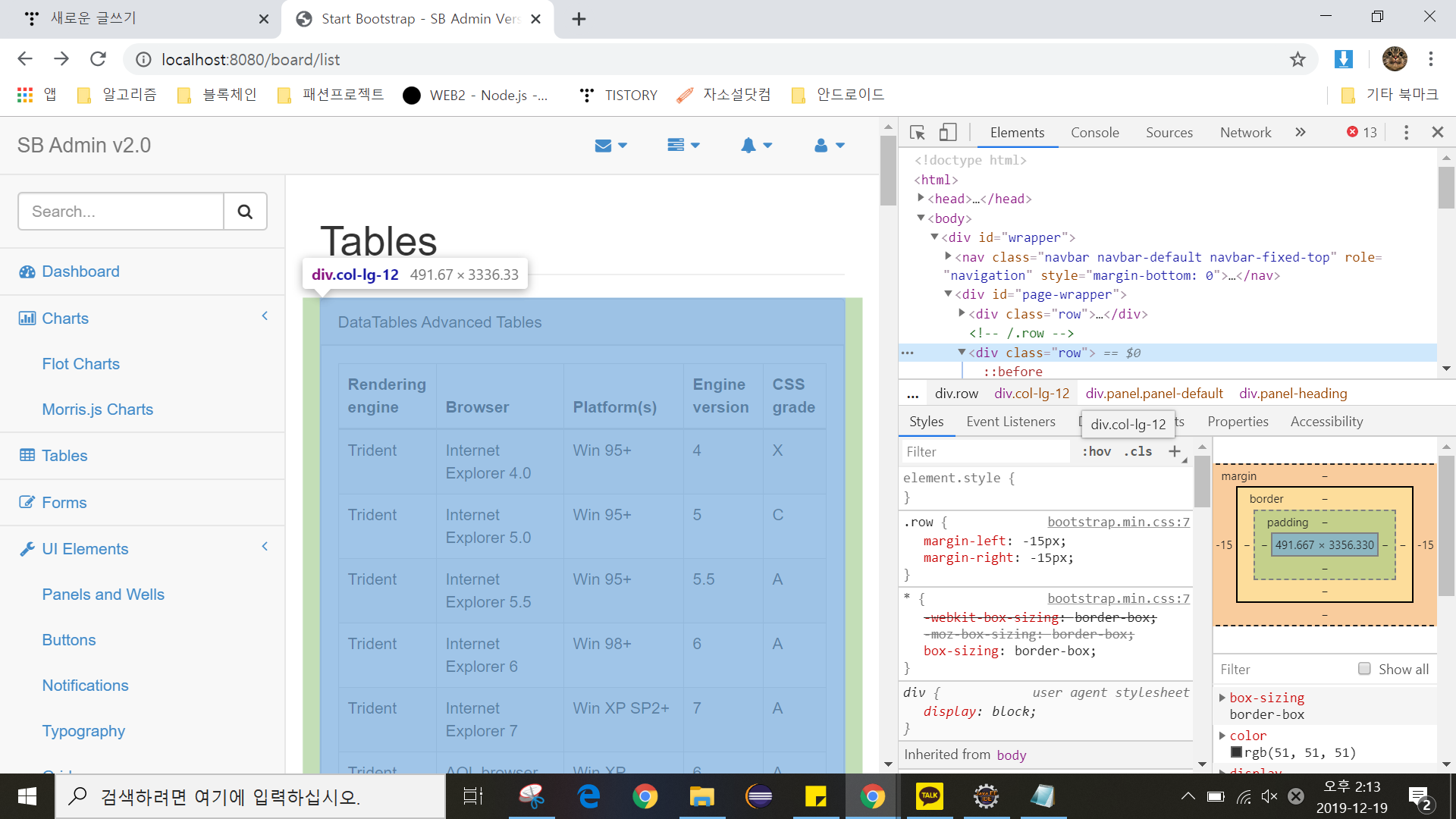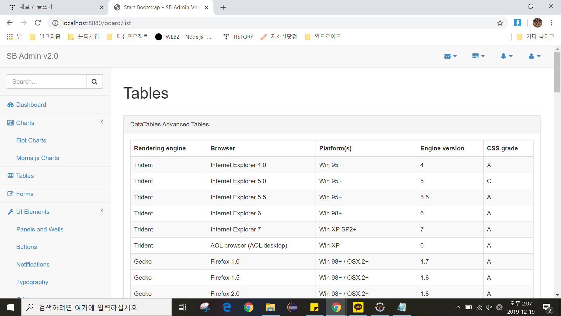 정상적으로 '/board/list' 페이지가 동작한다면 SB Admin2의 pages 폴더에 있는 tables.html의 내용을 list.jsp의 내용으로 그대로 복사해서 수정하고 실행한다.